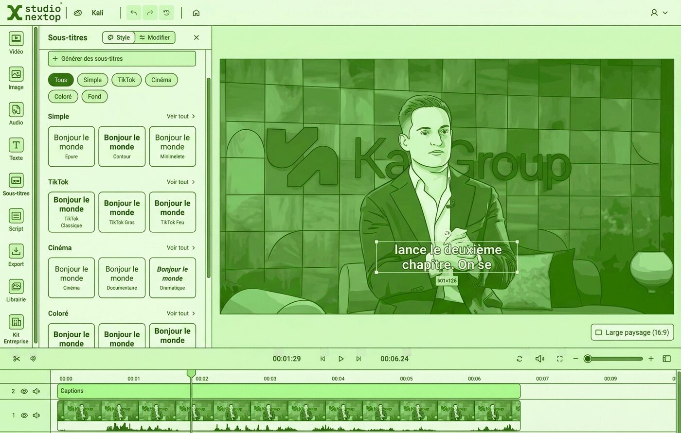 Transcription et sous-titrage en un clic, avec styles personnalisables — TikTok, Cinéma, Épuré. L'IA détecte chaque mot et synchronise parfaitement.